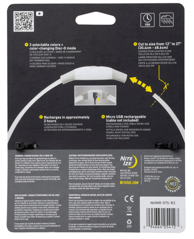 Deze vrijwel onverwoestbare Luxe Oplaadbare Multicolor XL Led Honden Halsband van het hoogwaardige Amerikaanse verlichtingsmerk Nite Ize staat bekend als de Rolls-Royce onder de lichtgevende hondenhalsbanden! De XL Max oplaadbare halsband is geschikt voor grote honden met een nekomtrek van 30 – 69 cm. De oplaadbare multicolor veiligheidshalsband is zichtbaar tot maar liefst 500 meter, brand maar liefst 55 uur(!) en staat garant voor jarenlang plezier en veiligheid! Deze luxe XL led halsband brandt naar keuze in rood, blauw, groen of multicolor. In het laatste geval vloeien alle kleuren van de regenboog voortdurend in elkaar over, wat zorgt voor een spectaculair disco-effect. Beter en leuker opvallen in het donker kan gewoon niet!